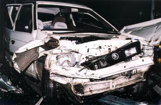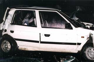. Bohužel nemám nejlepší fotku levej bok - kamošovi došel film a stejně to něšlo nafotit nebo to černé na pozadí je tma a zakliněná cisterna:-) ovšem takhle poničené favo jsem neviděl. Odnesl to akorát nějakýma řeznýma ranama od skla a natrženým vazem v levém rameni, což na to, že prostřední sloupek kopiroval řidičovu sedačku není tak špatné... Slečně vedle něj se nic nestalo. Za ním stála nová fiesta a osádka skončila se zlomeninami v nemocnici. A pak, že favority jsou měkké