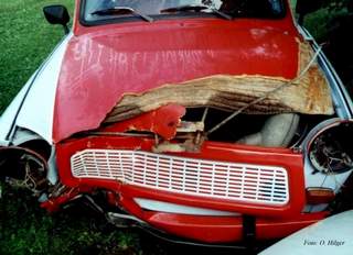 Bráchovi se povedlo ve 40 Km/h sejmout v Trabantovi sloup (rozdrtil betonovou patku,vyšplhal po dřevěným sloupu a ten následovně přerazil). A to jsme to ještě odtáhli 50km k nám na zahradu a trabík vesele jezdí dál (po 2 měsících práce).